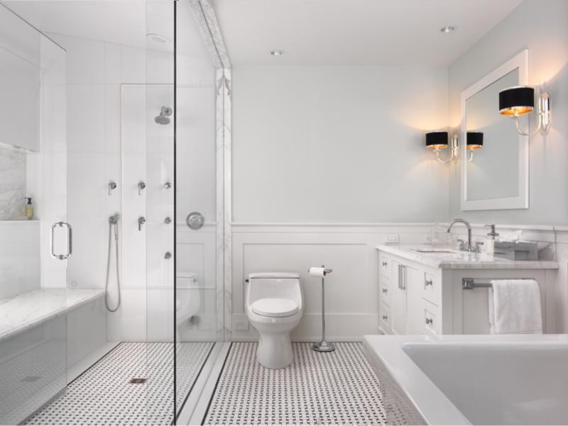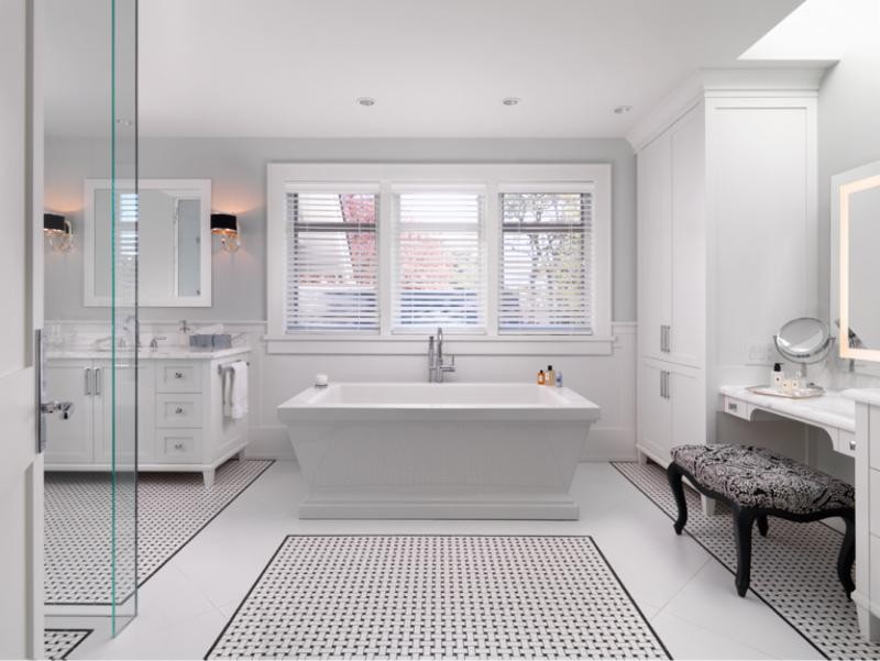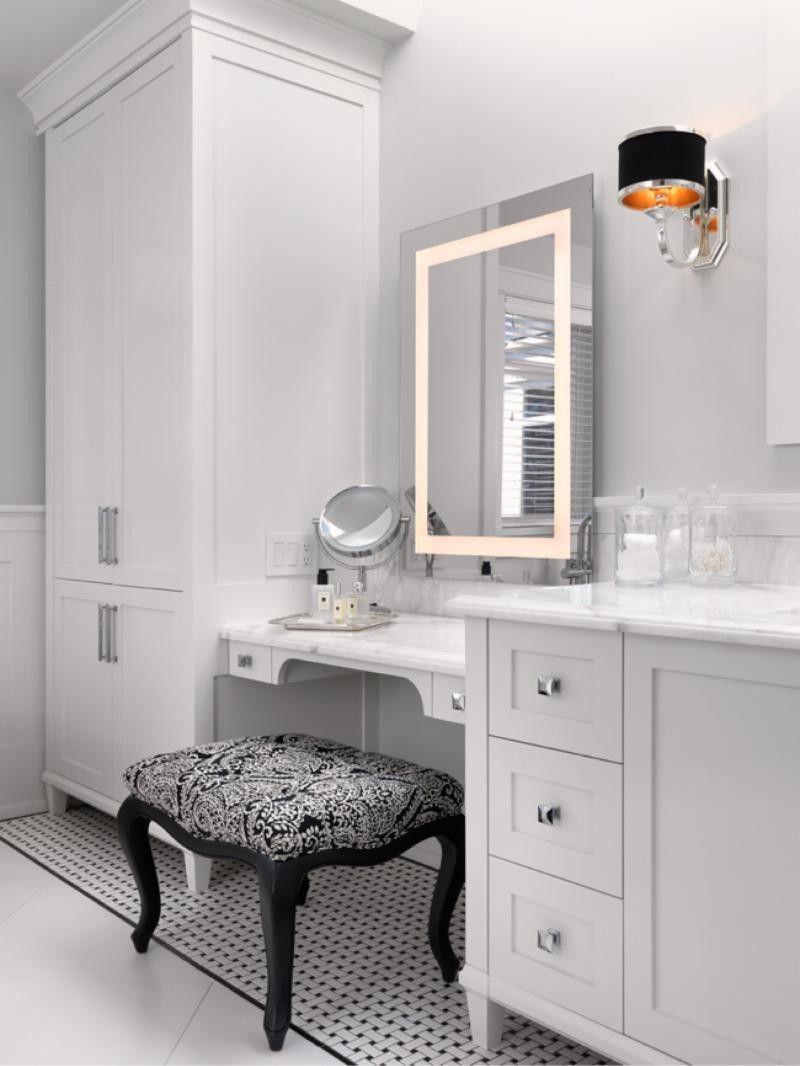 The fixed elements are classic and the ones that can be changed easily are trendy – like the makeup mirror and the black sconce shades. Easy changes can be made as the trends change or to refresh inexpensively.